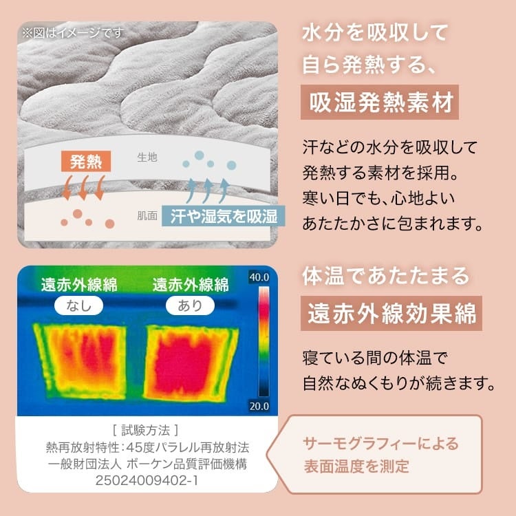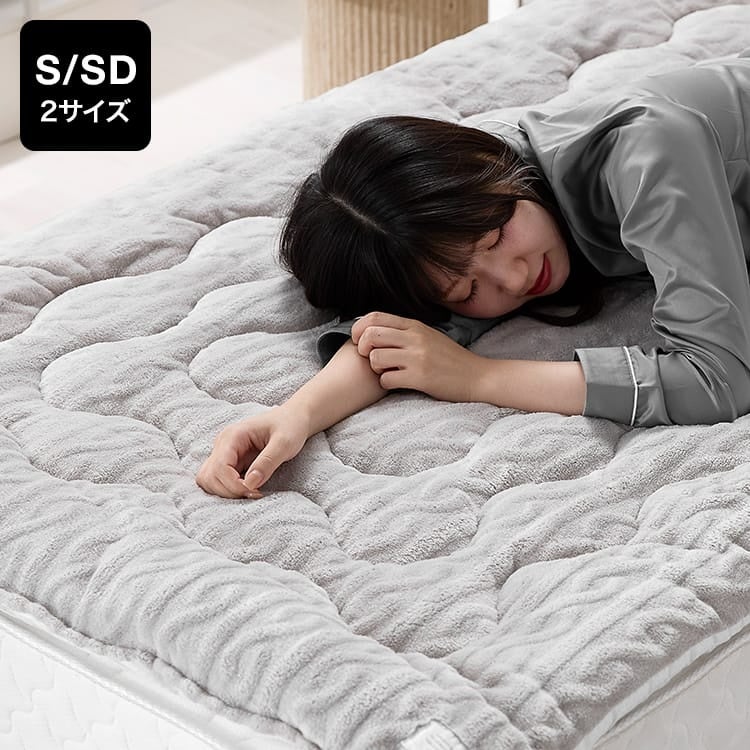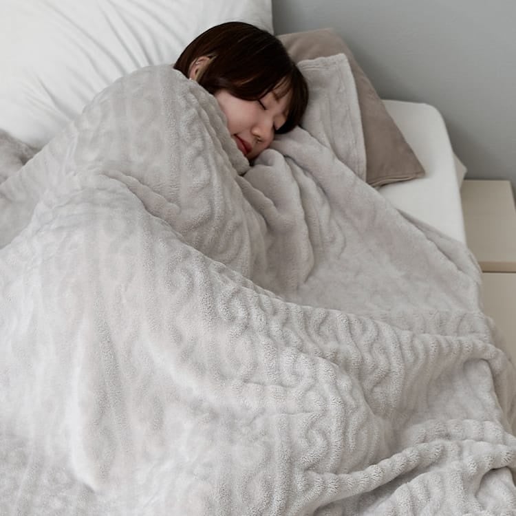最大の特長は、暖かさが続く「W発熱効果」。吸湿発熱綿と遠赤綿の2種類の発熱素材を組み合わせることで、身体から出る水分を熱に変え、寝ている間もぬくもりをキープします。さらに、ふかふかの極厚ボリュームで、もっちりと包み込まれるような贅沢な寝心地を実現。グレーを基調としたケーブルニット風のデザインが、インテリアにやさしく調和しながら、さりげない遊び心を添えます。