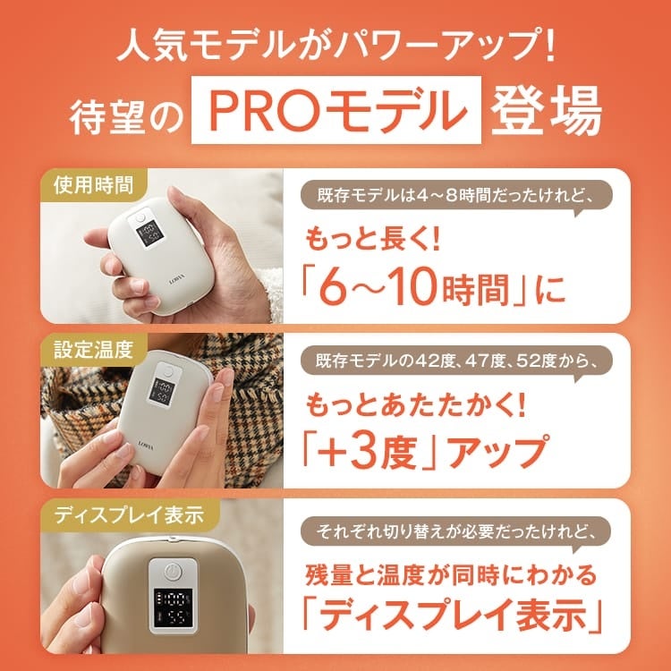 今年はよりパワフルになった「PROモデル」が新登場し、既存のモデルより+ 3℃の温度アップと10,000mAhの大容量バッテリーを搭載、最長10時間の連続使用が可能になりました。