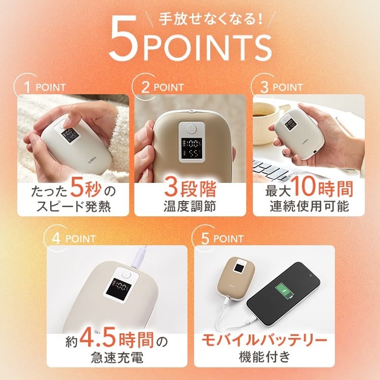 なんといっても、LOWYAの「充電式カイロ」は、内蔵バッテリーの電気で発熱体を温める仕組みで、スイッチを入れるとたった5秒ですぐに温まる、速暖性が魅力。またファッションの一部として取り入れられる洗練されたデザインや、モバイルバッテリー機能付きなど、日常に寄り添う機能性も人気の秘密です。