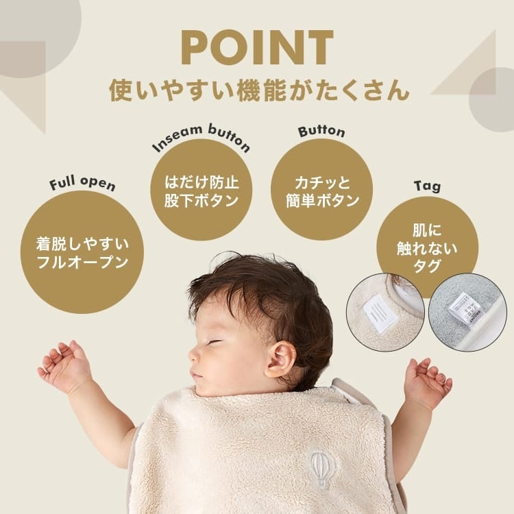 さらに、月齢を問わず着せやすいフルオープン仕様に改良され、立ったままでも、寝たままでもスムーズに着脱可能だけでなく、タグ類は肌に触れない位置に配置したので、デリケートな肌も安心◎