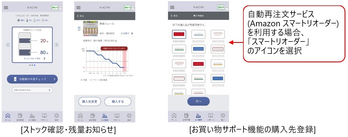 (*4) 「Amazonスマートリオーダー」を購入先に登録する場合、「日立冷蔵庫コンシェルジュアプリ」に加え、「Amazon Alexa アプリ」をダウンロードし、各種設定を行う必要があります。