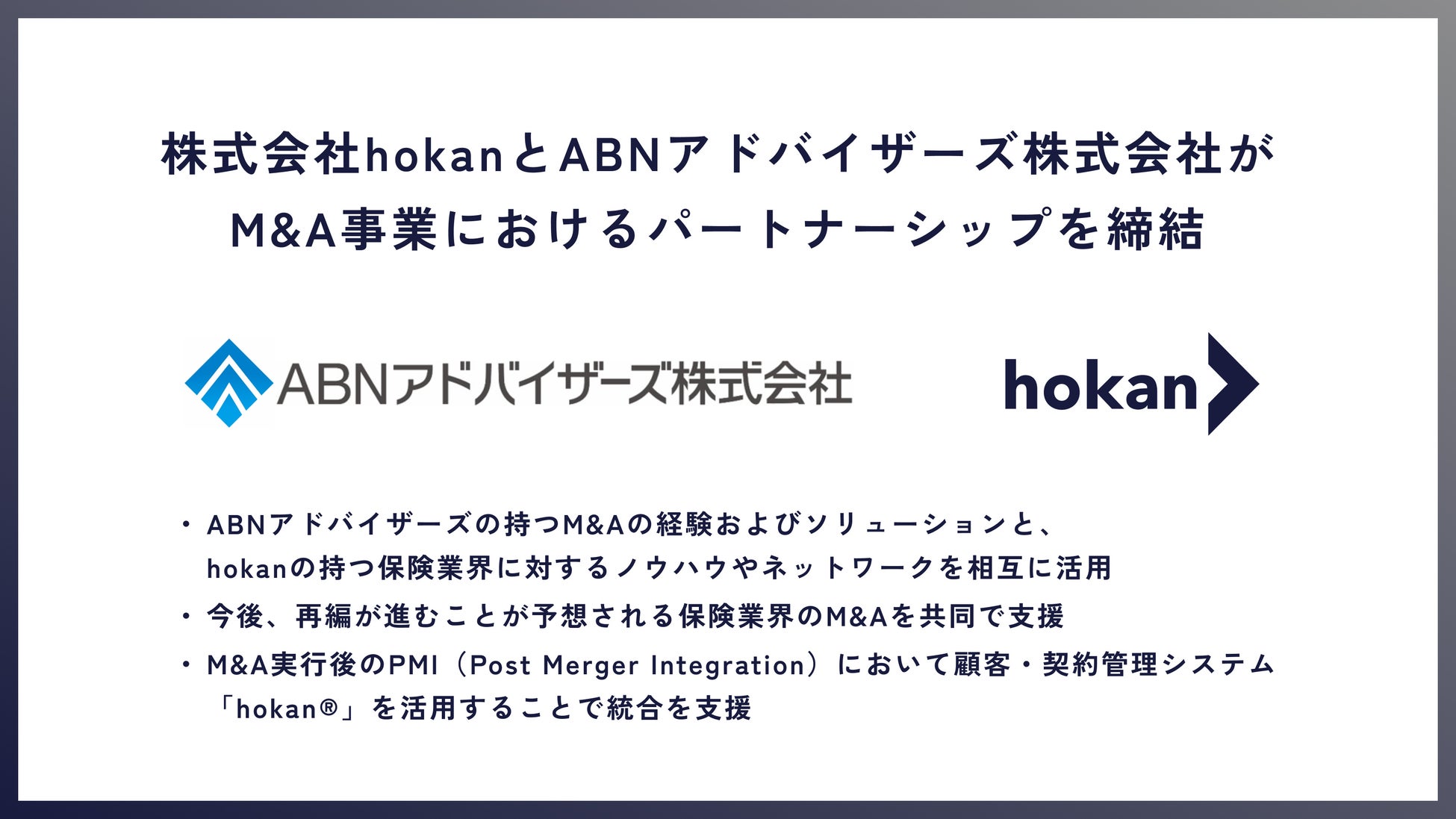 「適正な営業活動」と「組織の強固な監査体制」を実現するクラウド型保険代理店システム「hokan®」を提供する株式会社hokan(ホカン、本社:東京都中央区、代表取締役社長:小坂直之、以下:当社)とABNアドバイザーズ株式会社(本社:東京都千代田区、代表取締役社長:山本圭一)は、この度、保険業界における事業承継や戦略的成長事業に関する各種課題の解決を目的としたM&A事業に関するパートナーシップを締結したことをお知らせいたします。