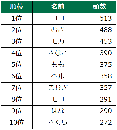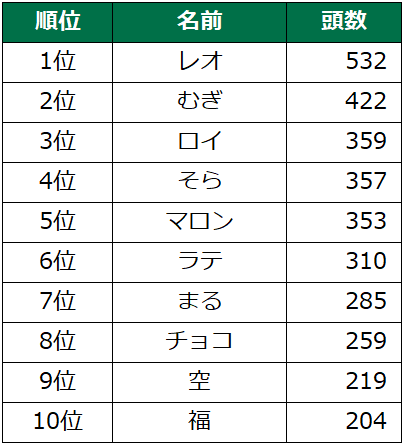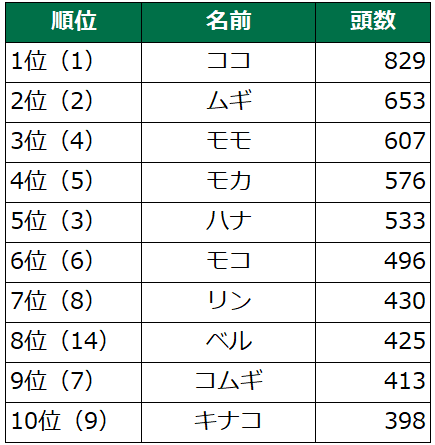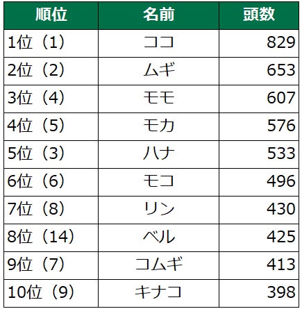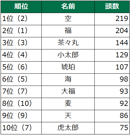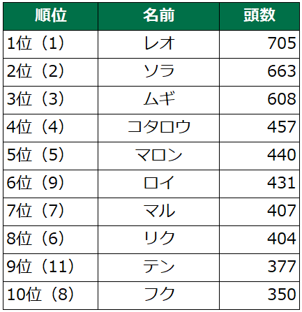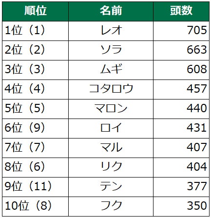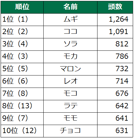 総合ランキングでは、「ムギ」が一昨年、昨年に続き3連覇。2位に「ココ」、3位に「ソラ」が続きました。上位の名前に大きな変動は見られませんでしたが、TOP10圏内では、昨年13位の「ラテ」が8位に、12位の「チョコ」が10位にランクインしています。