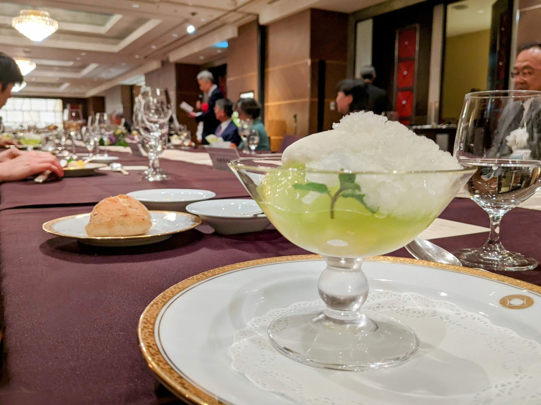 式典後の食事会では、ニューオータニが手がけた「ニンジャペーストで仕立てた芳醇なマスクメロンのクープ仕立て」が提供され、小泉元総理や公益財団法人 安藤スポーツ・食文化振興財団の安藤宏基理事長(日清食品ホールディングス株式会社 代表取締役社長・CEO)をはじめ、同式典に参加いただいた皆様にご実食いただきました。