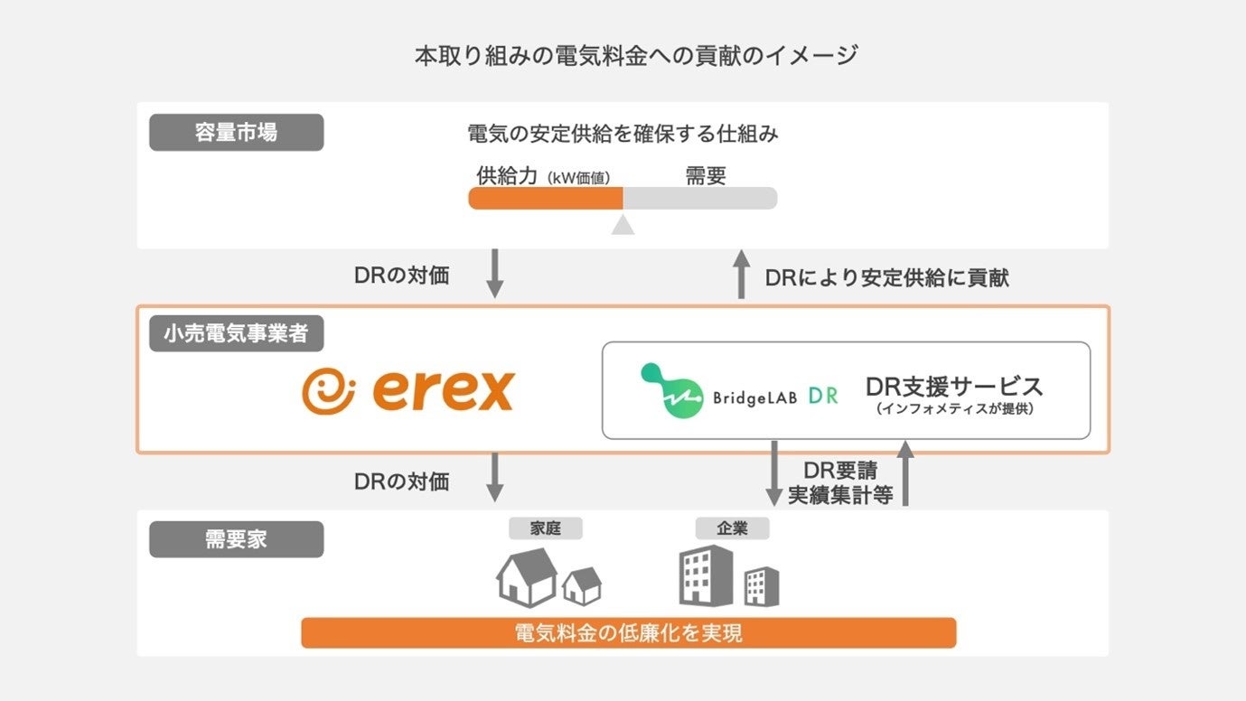 脱炭素をミッションとしてエネルギー事業を国内外で展開するイーレックス株式会社(本社:東京都中央区、代表取締役社長:本名 均、以下「イーレックス」)は、クラウド型デマンドレスポンス支援サービス「BridgeLAB DR(ブリッジラボ ディーアール)」を提供するインフォメティス株式会社(本社:東京都港区、代表取締役:只野 太郎、以下「インフォメティス」)と協業し、2024年4月に開始される容量市場に対応したデマンドレスポンス(*1)(以下、「DR」)を、小売電気事業者がクラウド上で簡便に行える新機能の開発を開始します。