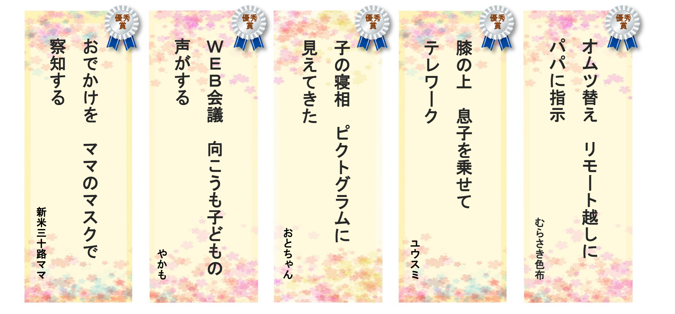 受賞作品以外にも、子育てをしながらのテレワーク、リモートワークにおける心温まるエピソードが数多く寄せられました。リモートワークにより公私の垣根が曖昧になったことで、これまで職場では見えてこなかった、それぞれの人がプライベートで大切にしているものの存在に目を向けるきっかけになったのではないでしょうか。子育て中の方に限らず、皆さんが大切にしているものを尊重できる世の中になっていくことを願って選考しました。また、このご時世ならではのエピソードとして、コロナ禍に生まれたお子さんにとってはマスクが生活の一部として当たり前のように溶け込んでいることにハッと気付かされる川柳や、2021年夏に東京で開催された世界的なスポーツ大会と子どもと過ごす日常をうまくリンクさせた作品も編集部内で好評でした。