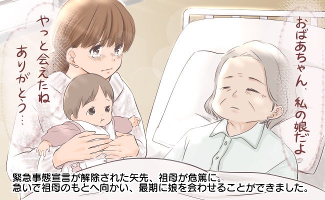 2021年4月に出産したものの祖母とはコロナ禍で全く会えず、電話で娘の声を聞かせるだけ。東京でも緊急事態宣言が解除された矢先、祖母が危篤となってしまい急いで娘を会わせました。その後亡くなりましたが、娘もそうですが私自身も祖母に会えて良かったと心から思います。ありがとう。