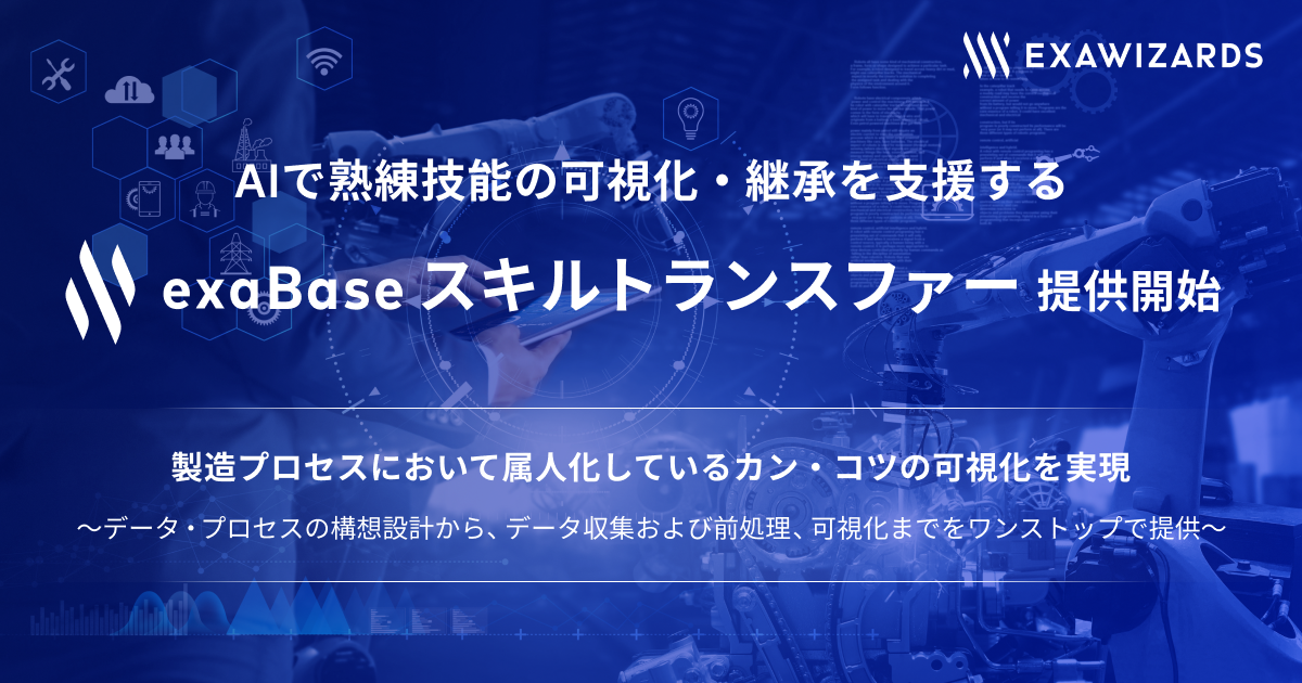 AIを利活用したサービスによる社会課題解決に取り組む株式会社エクサウィザーズ(東京都港区、代表取締役社長:石山 洸、以下、エクサウィザーズ)は、同社が提供するマルチモーダルなロボットAIソリューション「exaBase ロボティクス」によって、製造プロセスにおける熟練作業の効率的な可視化・技能継承を実現する「exaBase スキルトランスファー」の提供を開始しました。