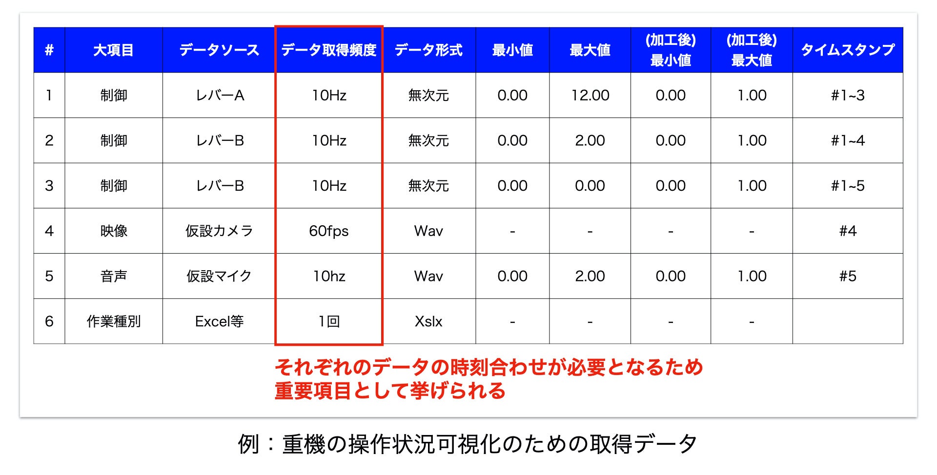 上記のような課題に対し、ロボットAI制御の知見から、最終的な分析を行う上で扱いやすいセンサーの選定支援と取得すべきデータ形式について定義します。
