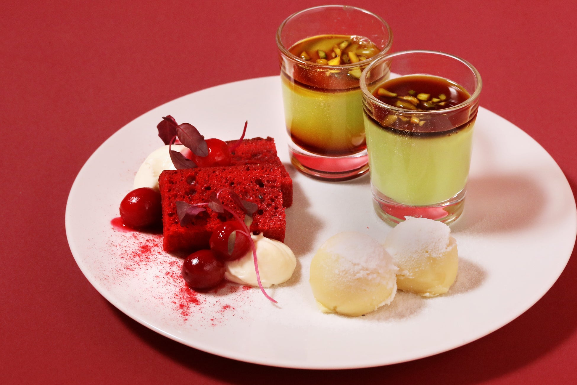 主役となる苺のロゼテリーヌやプレートの随所にピスタチオを散りばめながら、赤・白・緑の“三色のパレット”で冬の味わいを多彩に表現しています。