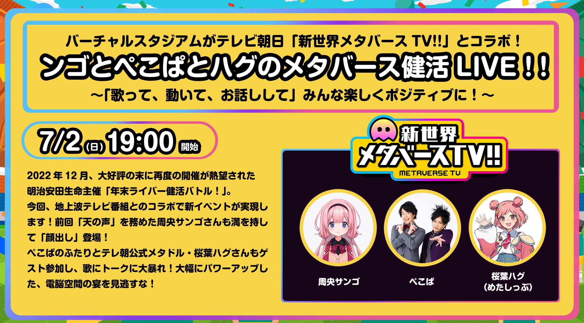 ■7/2(日)よる7時〜 「ンゴとぺこぱとハグのメタバース健活LIVE!!