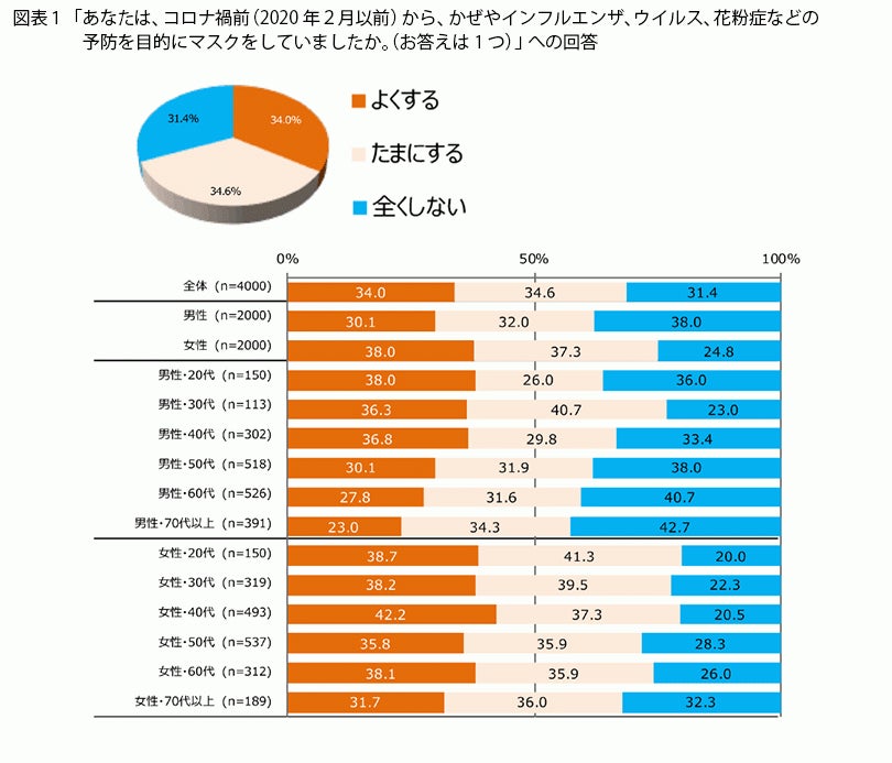 まず、「コロナ禍前(2020年2月以前)から、かぜやインフルエンザ、ウイルス、花粉症などの予防を目的にマスクをしていましたか」と質問しました。全体では「よくする」が34.0%、「たまにする」が34.6%、「全くしない」が31.4%と、ほぼ三等分という結果になりました。ほんの2年前までは「よくする」人が3割ほど。現在の状況からすると、ずいぶん遠い世界のように感じます。
