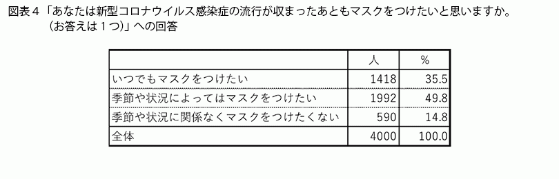 コロナ禍が収束したあと、マスクをつけるかどうか聞いたところ(図表4)、「いつでもマスクをつけたい」と回答した人が35.5%と、かなり高い割合になっています。