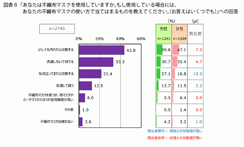 使い方について聞いたところ(図表8)、最も多かったのは「少しでも汚れたら交換する」(43.8%)という人でした。布マスクやガーゼマスクは洗濯して繰り返し使えることをウリにしていますが、不織布マスクも「洗濯して使う」人が12.5%いました。ただし、「洗濯しないで捨てる」(33.3%)人のほうが多数派です。