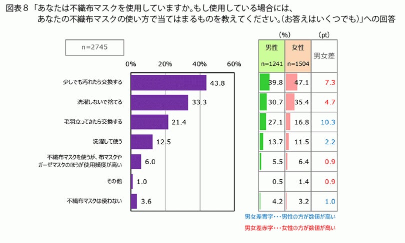 ちなみに「毛羽立ってきたら交換する」のは男女で差が大きく、女性16.8%に対し、男性は27.1%となっています。男性のほうが、1枚のマスクを長く使う傾向にあるようです。