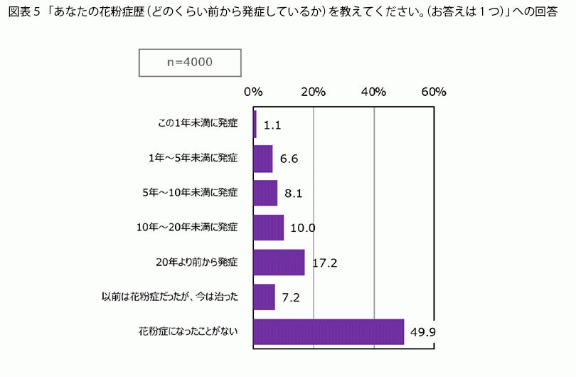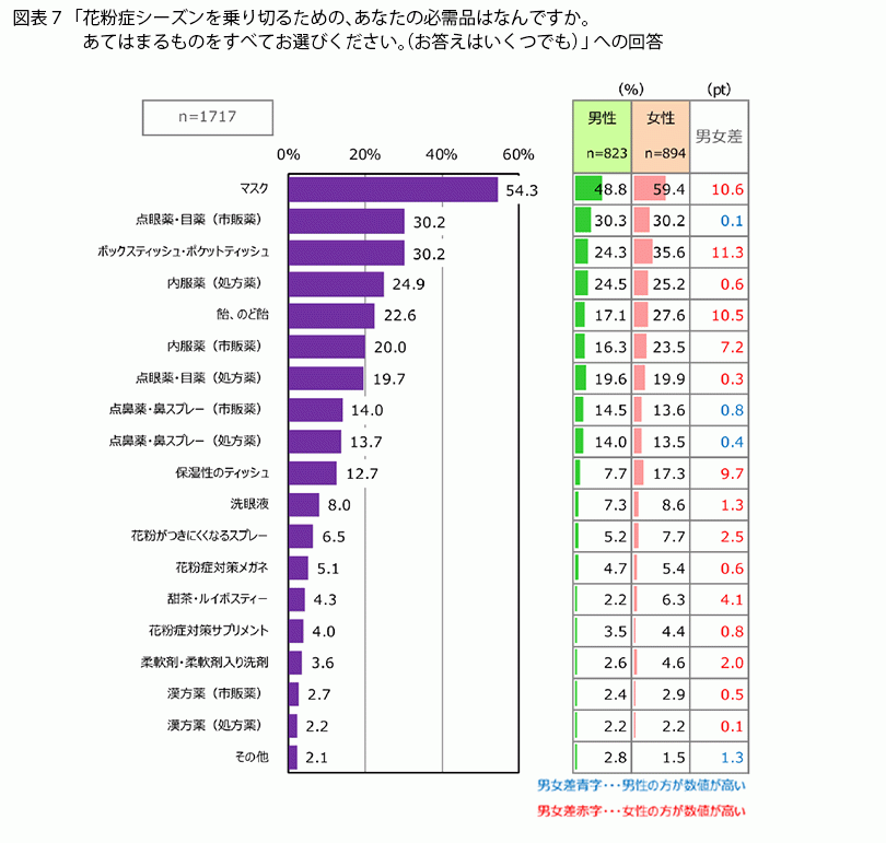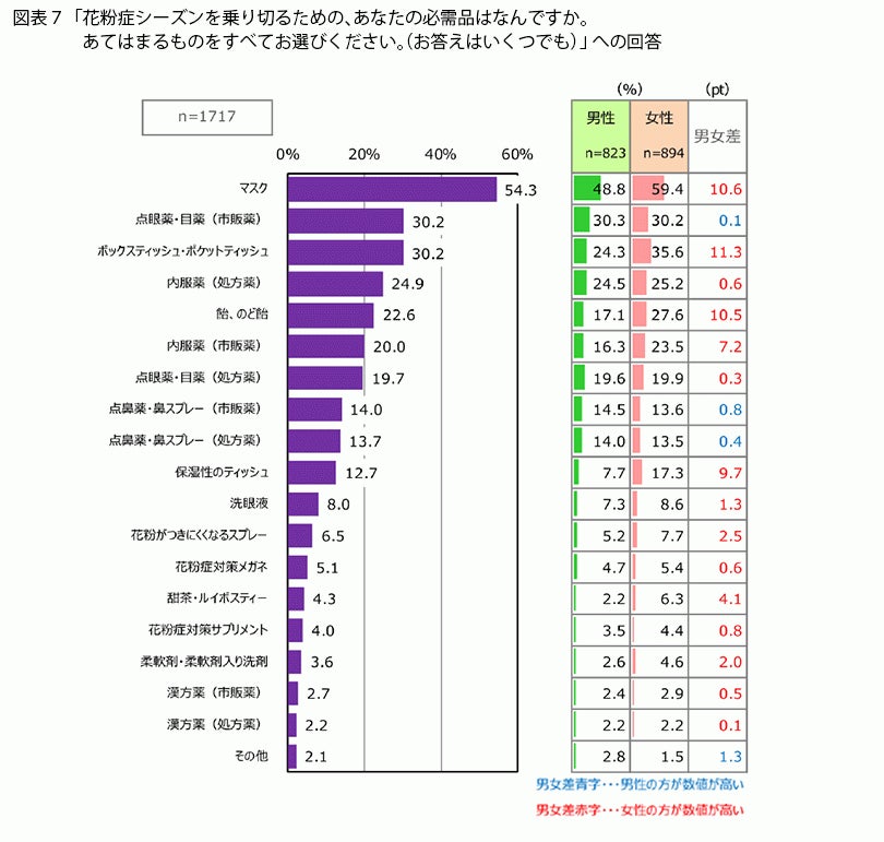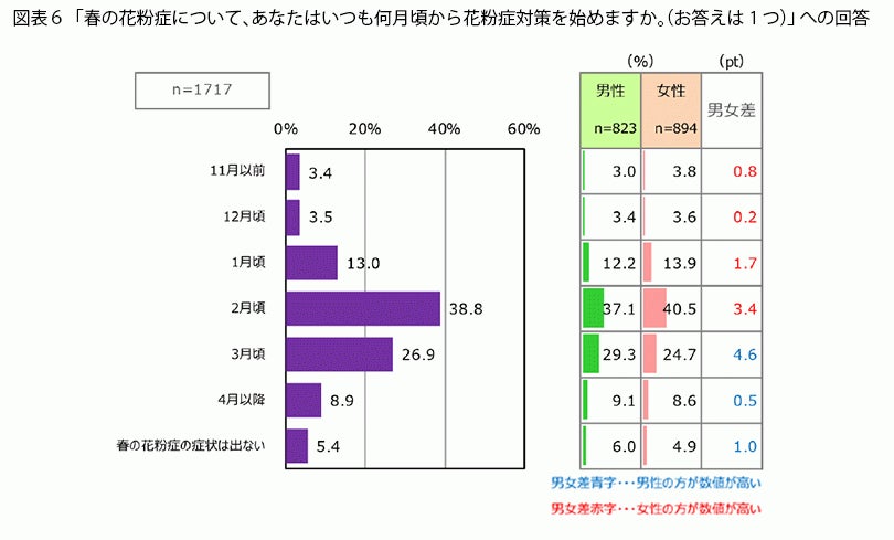 そろそろ春の花粉症に悩まされる時期がやってきますが、いつ頃から花粉症対策を行うか聞いたところ(図表6)、最も多いのは「2月頃」(38.8%)でした。そして、わずかですが、女性のほうが男性よりも早めに対策を始める傾向があるようです。