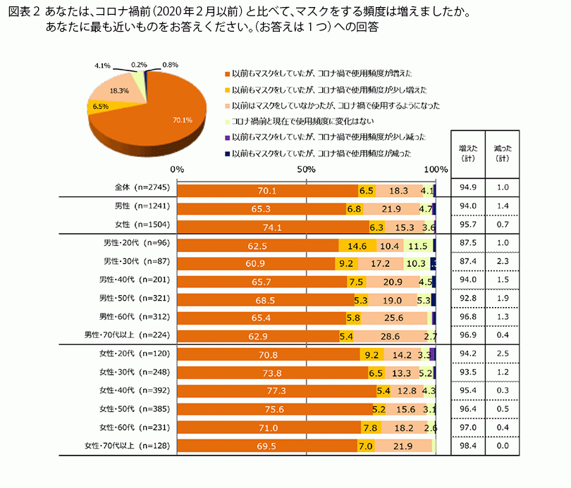 また、コロナ禍によって初めてマスク習慣を身に付けたという人は少なくないようで、「以前はマスクをしていなかったが、コロナ禍で使用するようになった」という人が全体で18.3%います。先程の質問(図表1)では、「全くしない」と回答した人の割合が年代が上がるほど増える傾向がありました。その裏返しか、「コロナ禍で使用するようになった」人の割合も、男女ともに年代が上がるほど多い傾向にあり、「男性・60代」(25.6%)、「男性・70代以上」(28.6%)、「女性・70代以上」(21.9%)の3区分は2割を越えています。