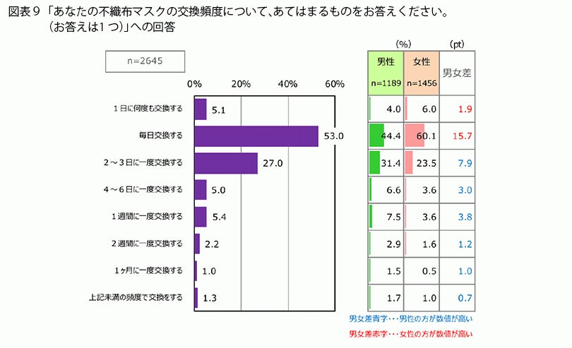では、具体的な交換頻度はどうでしょう(図表9)。「毎日交換する」(53.0%)と回答した人が最も多く、半数を超えています。ただし、女性の60.1%に対して、男性は44.4%と、結構な開きがあります。