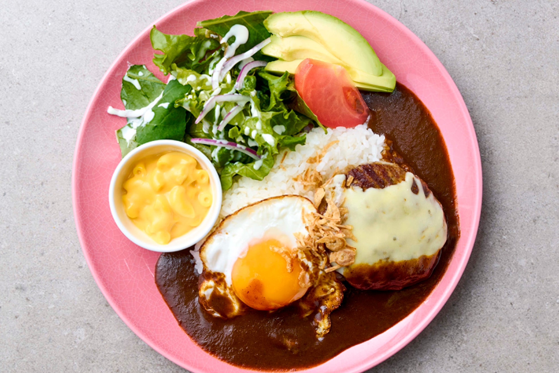 とろーりとろけるナチュラルチーズをふんだんに使った濃厚チーズと和牛100%のハンバーグのハーモニーを楽しめるロコモコボウルです。