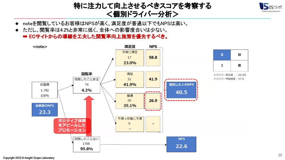 このケースでは、noteを閲覧している顧客は満足度が普通以下でもNPSが高いということがわかりました。そこから、「いかにコンテンツを見てもらうか」に注力すべきという判断が下せます。
