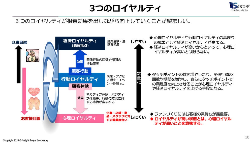 経済ロイヤルティとは、購買量・頻度によるものです。対局にあるのが心理ロイヤルティで、企業・店舗・商品・スタッフに対する愛着度合いを示します。中間にあるのが行動ロイヤルティで、施策の焦点になりやすいものです。この3つを上げていくことが大切です。