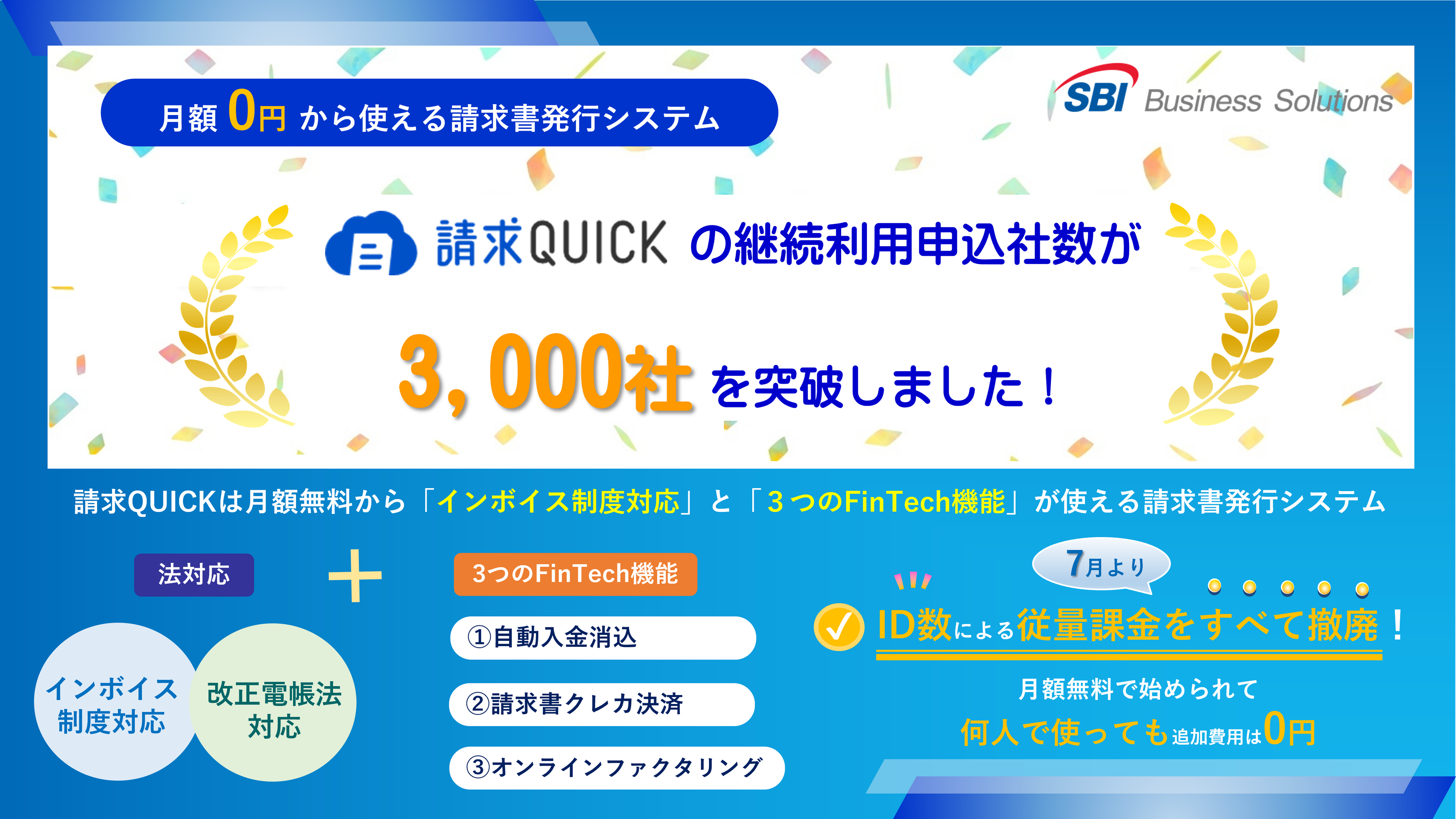 総合フィンテックソリューション企業であるSBI FinTech Solutions株式会社の子会社で、バックオフィス支援サービスを提供するSBIビジネス・ソリューションズ株式会社(本社:東京都港区、代表取締役社長:夏川 雅貴、以下「当社」)は、中小企業のインボイス制度対応と業務効率化をサポートするクラウド型請求書管理システム「請求QUICK」において、継続利用のお申し込み社数が3,000社を突破しましたので、お知らせいたします。