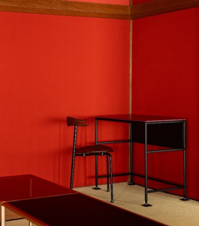・加賀五彩・・・伝統色のひとつ、臙脂(えんじ)を天板カラーに用いたデスクを展示します。静謐な空間に、控えめな華やかさと精神性を添えます。