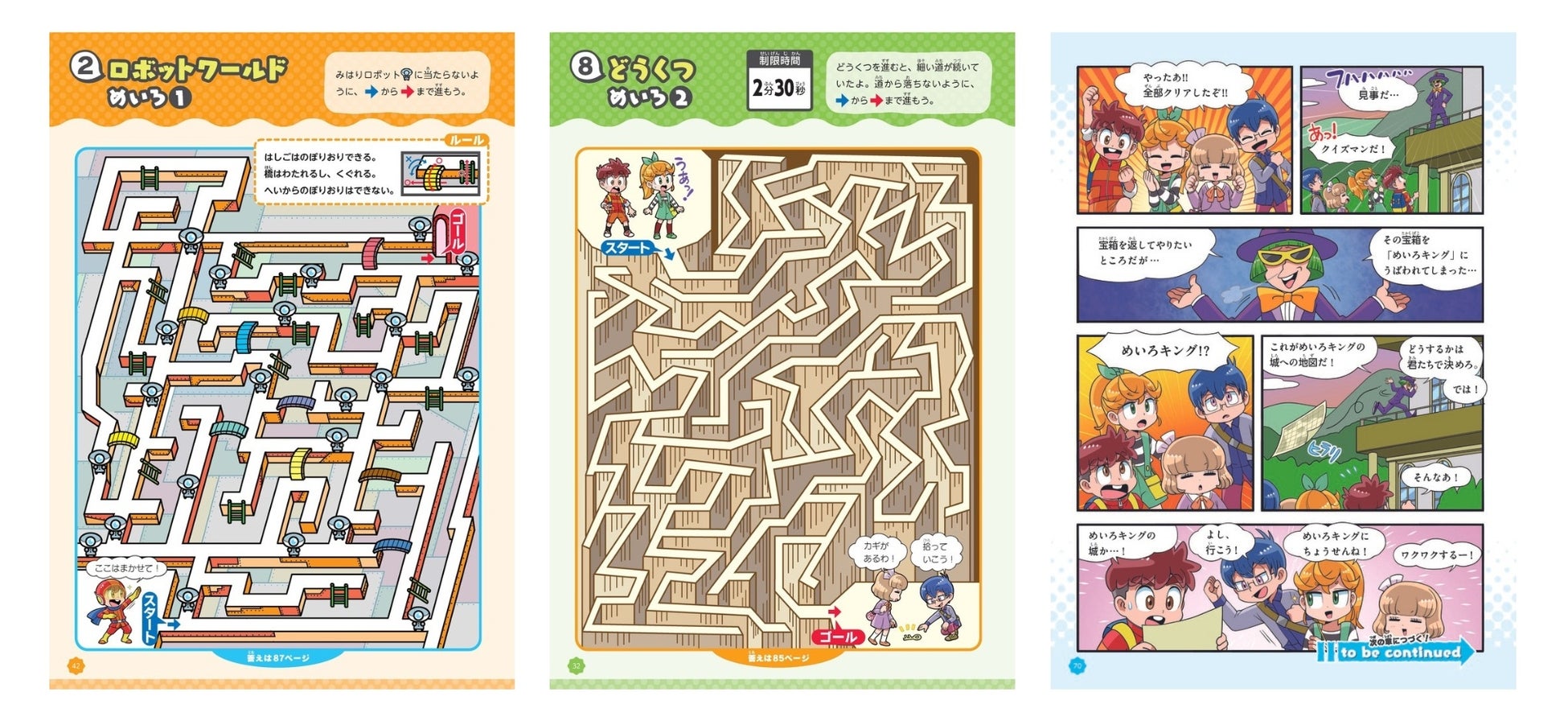 迷路というと、ただの遊びだと思われがちです。しかし、迷路を解くにはさまざまな脳の力が必要で、それが学習に役立っていきます。多種多様なめいろに取り組むことを通じて、集中力や思考力、推理力、空間認識能力などを養うことをねらいとしています。