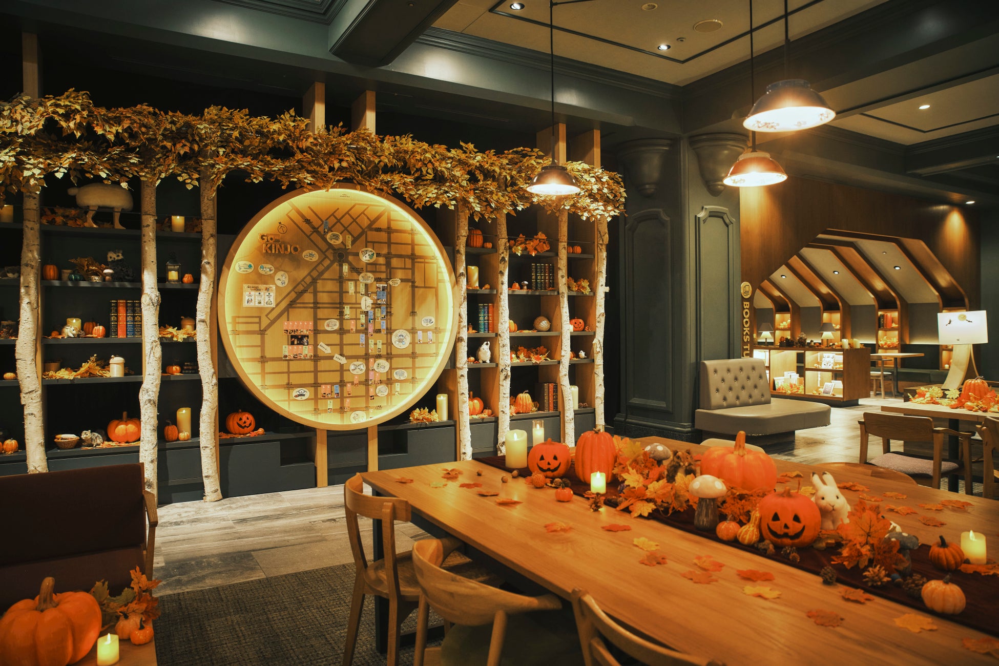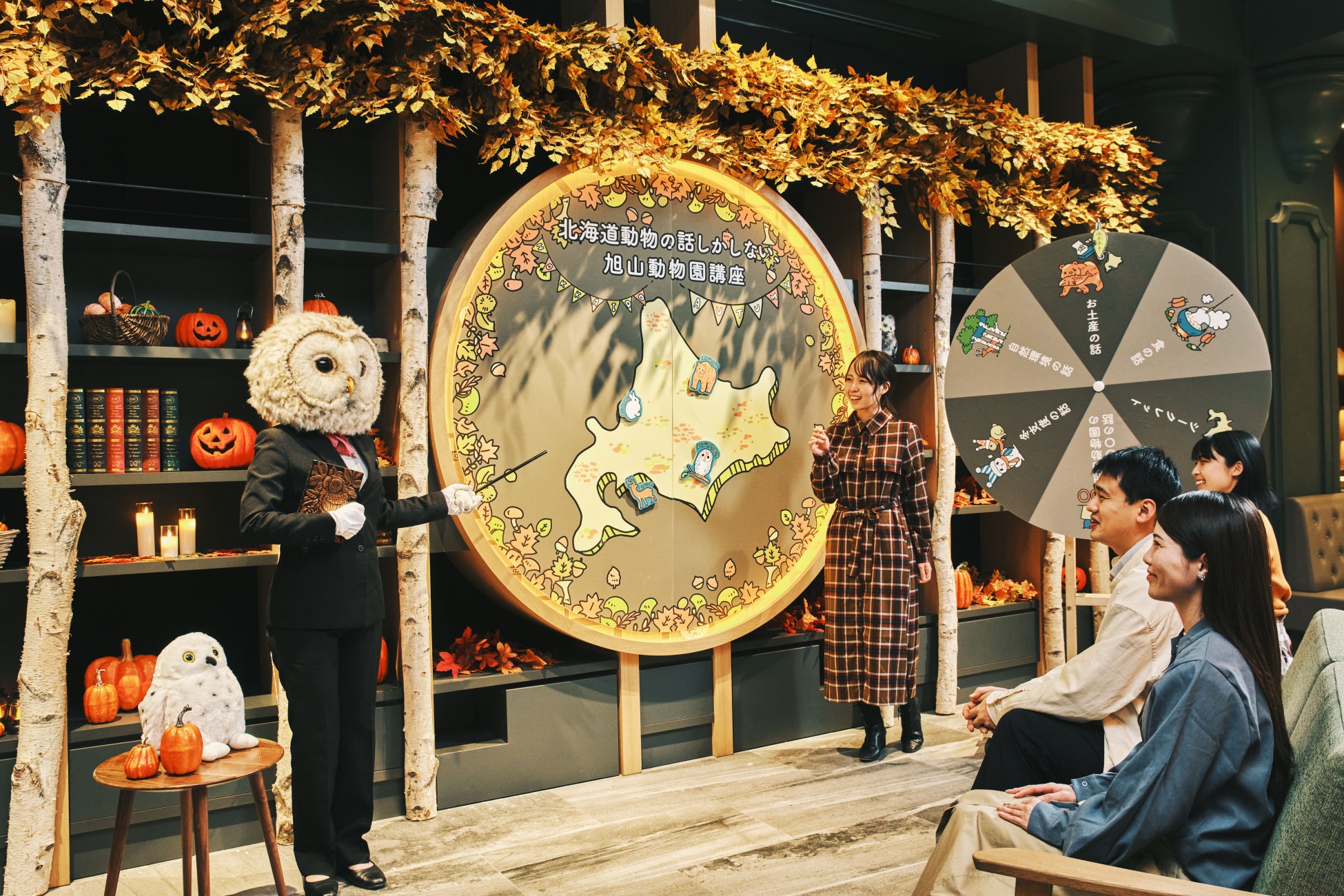 本イベント期間中、OMOベースは北海道の秋の森をイメージした設えに変身。正面玄関から入ってすぐにある白樺テーブルやご近所マップは、北海道らしい白樺の紅葉をイメージした設えになります。さらに、OMOベースにいるどうぶつのぬいぐるみ達は、ハロウィンの仮装をしているので、旅の思い出に写真を撮影する場所としてもおすすめです。