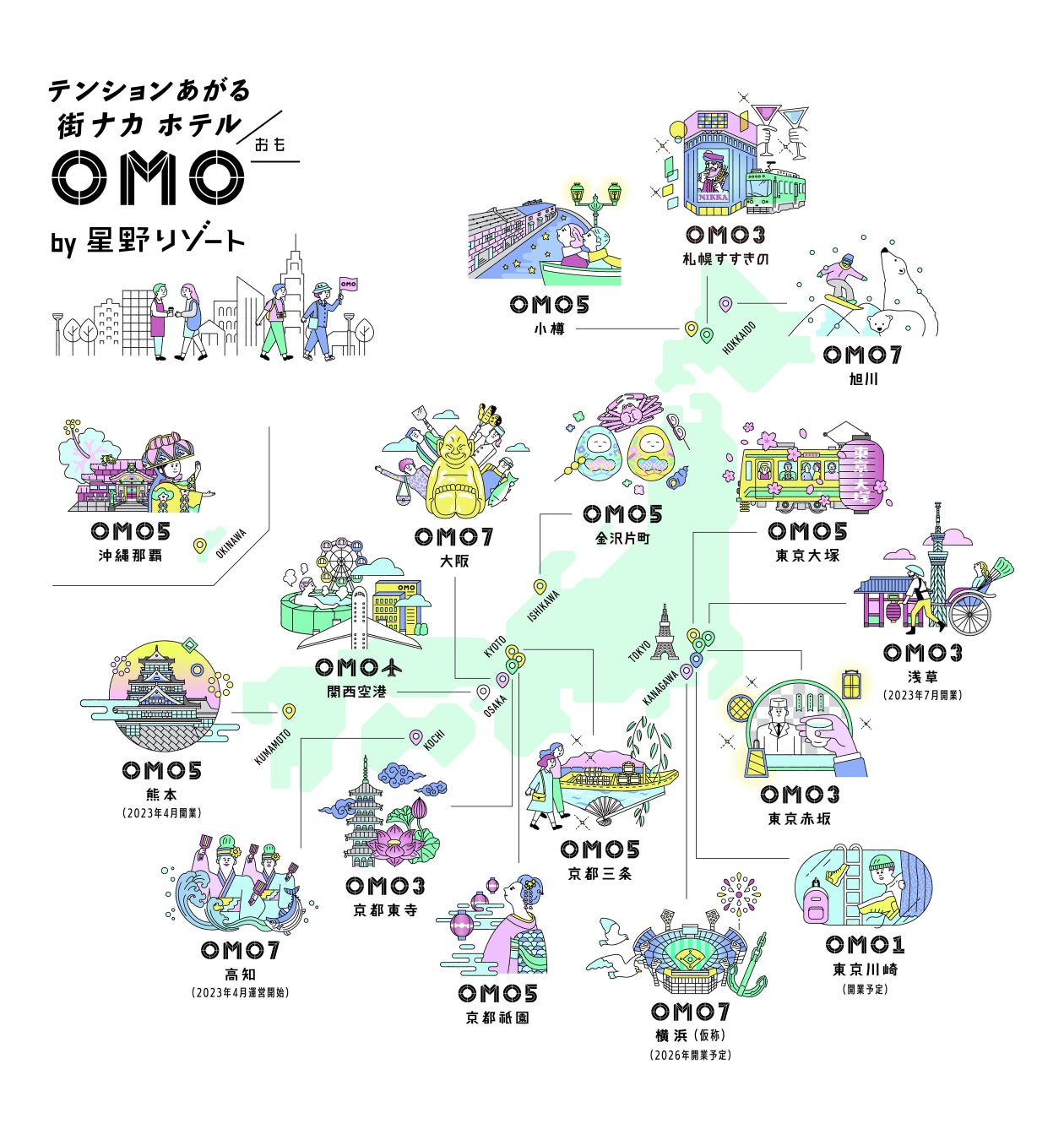 「OMO」は星野リゾートが全国に展開する「テンションあがる『街ナカ』ホテル」。地域と一体となって街を楽しみ尽くす旅を追求しています。全てのOMOで、街歩きをサポートするサービス「Go-KINJO」を展開。全国各地の12施設から都市観光の楽しさを発信していきます。