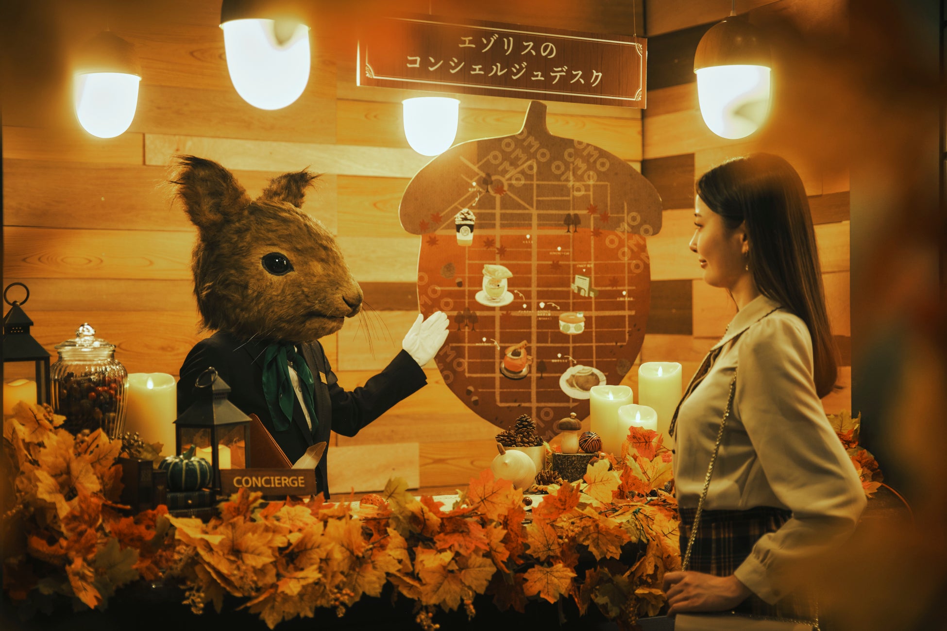 昨年は4種類の北海道どうぶつがOMO7旭川に登場し、入口でゲストをお出迎えしたり、ウェルカムドリンクを配ったりして、ハロウィンを盛り上げました。今年は新たに、エゾリスがコンシェルジュとして登場。ホテル周辺の秋の味覚を堪能できるお店をまとめた「どんぐりマップ」を用いて、ゲストの滞在をサポート。全5種類の北海道どうぶつがここでしか体験できないハロウィンイベントを彩ります。