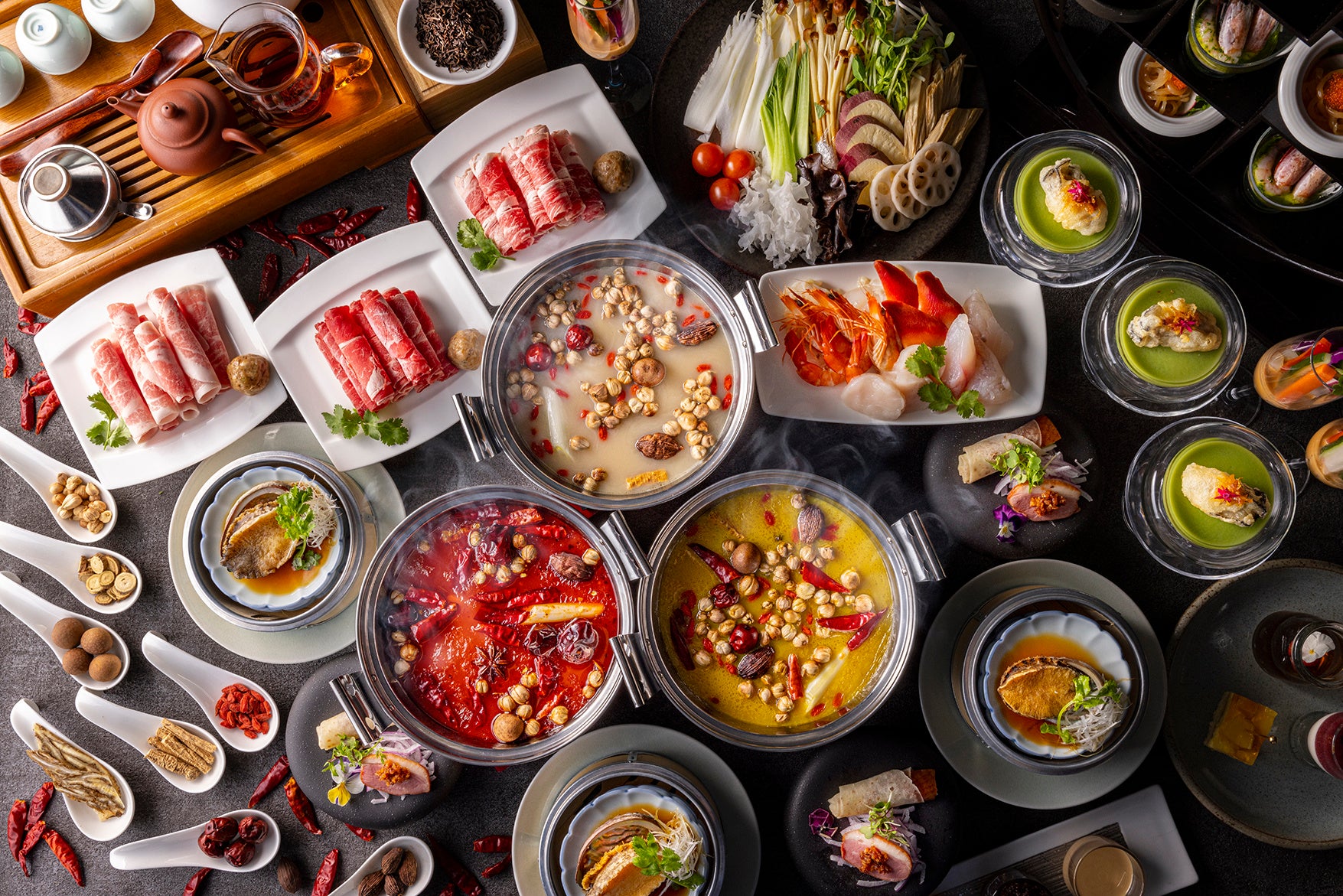 《お一人様専用鍋でいただく、選べる火鍋3種類》鮑、牡蠣、北京ダックが揃うシェフズ・スペシャルやデザートもセット