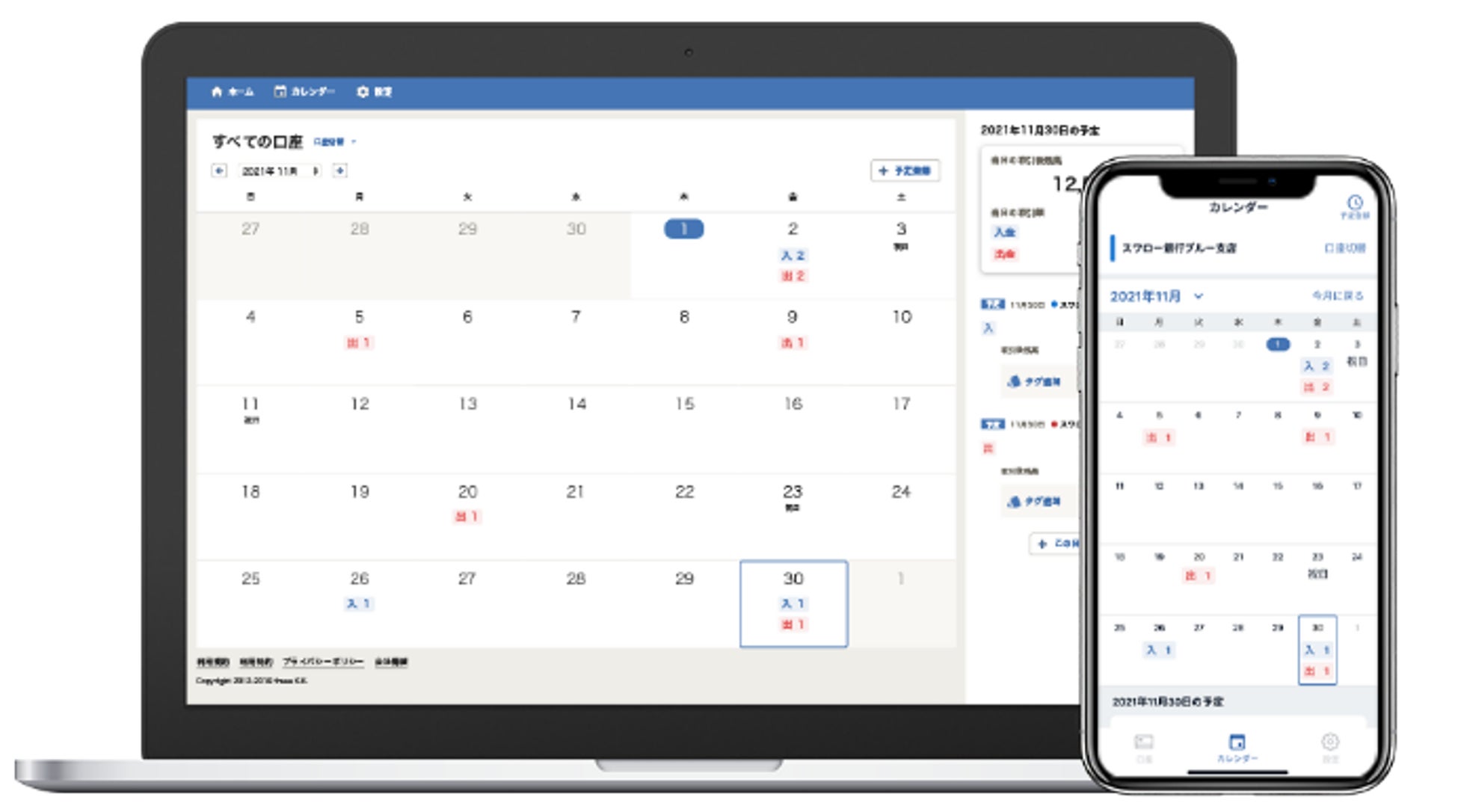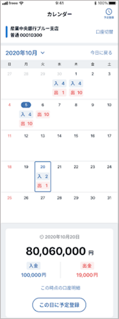 月単位で表示されるカレンダー画面で、入出金の有無と件数が一覧化されるため、入出金予定が見やすく、支払い忘れを未然に防ぐことができます。