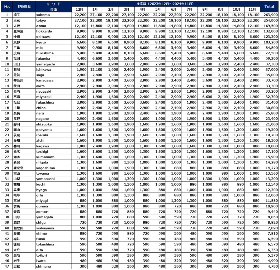 以下の表は、2023年12月~2024年11月のベトナムにおける「日本の都道府県」の検索数をまとめたものです。検索数の上位を占めた2位東京、3位大阪、6位京都の大都市圏及び、4位北海道、5位沖縄、8位広島については、これまでアウンコンサルティングが発表した米国編及び、オーストラリア編の調査と同様の傾向であると考えられますが、他国を対象とした調査と大きく異なり、今回ベトナムで検索数の第1位になったのは、埼玉です。