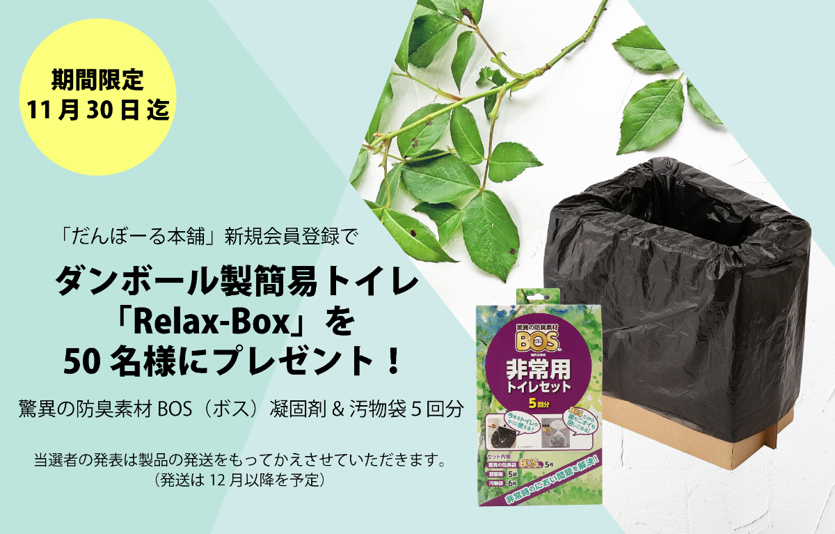 「だんぼーる本舗」は2023年11月1日(水)~11月30日(木)の期間限定で、新規会員登録者を対象にダンボール製簡易トイレ「Relax-Box」(5回分)が抽選で50名様に当たるキャンペーンを開始!