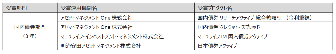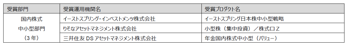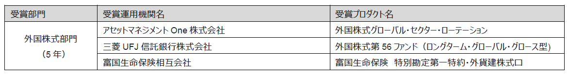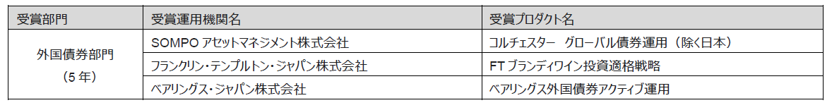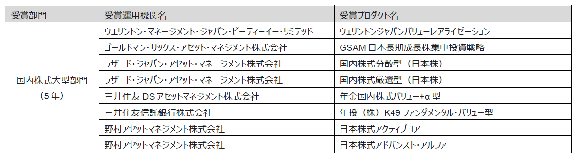 企業年金運用における主要なカテゴリー毎に5年あるいは3年で、トータル・リターンと代表的なインデックスに対するインフォメーション・レシオをそれぞれ基準化した数字を合計し、カテゴリー内の上位 10%(ただし、最大8プロダクトまで)あるいは上位3位のファンドの多い方を選定します(なお、国内株中小型、国内債券と外国債券はトータル・リターンのみ)。表彰対象とする運用プロダクトは、マーサーが管理する運用パフォーマンス・ユニバースに選定基準日時点で登録されているプロダクトのうち、日本国内に拠点を持つ会社が提供する運用プロダクトとし、その中で、マーサーが予め定めた基準(受賞意思の表明、カテゴリーの特性、最低資産額、実際の運用でのリターン、国内拠点の存在)に合致したプロダクトとしています。それゆえ、マーサーの運用パフォーマンス・ユニバース中には、受賞プロダクトよりも優れた運用パフォーマンスを挙げながらも受賞基準を満たさないことから受賞していない運用プロダクトがある場合があります。