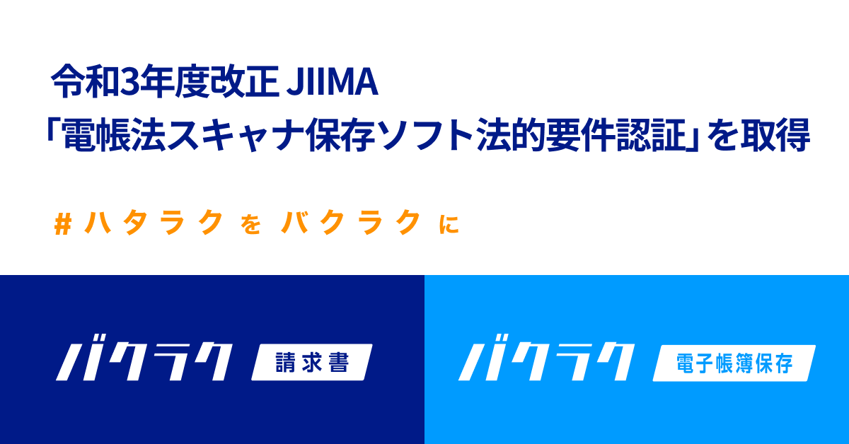 株式会社LayerXが提供する 「バクラク請求書」と「バクラク電子帳簿保存」は、公益社団法人日本文書情報マネジメント協会(以下JIIMA)の令和3年度改正に対応した「電帳法スキャナ保存ソフト法的要件認証」を取得しました。