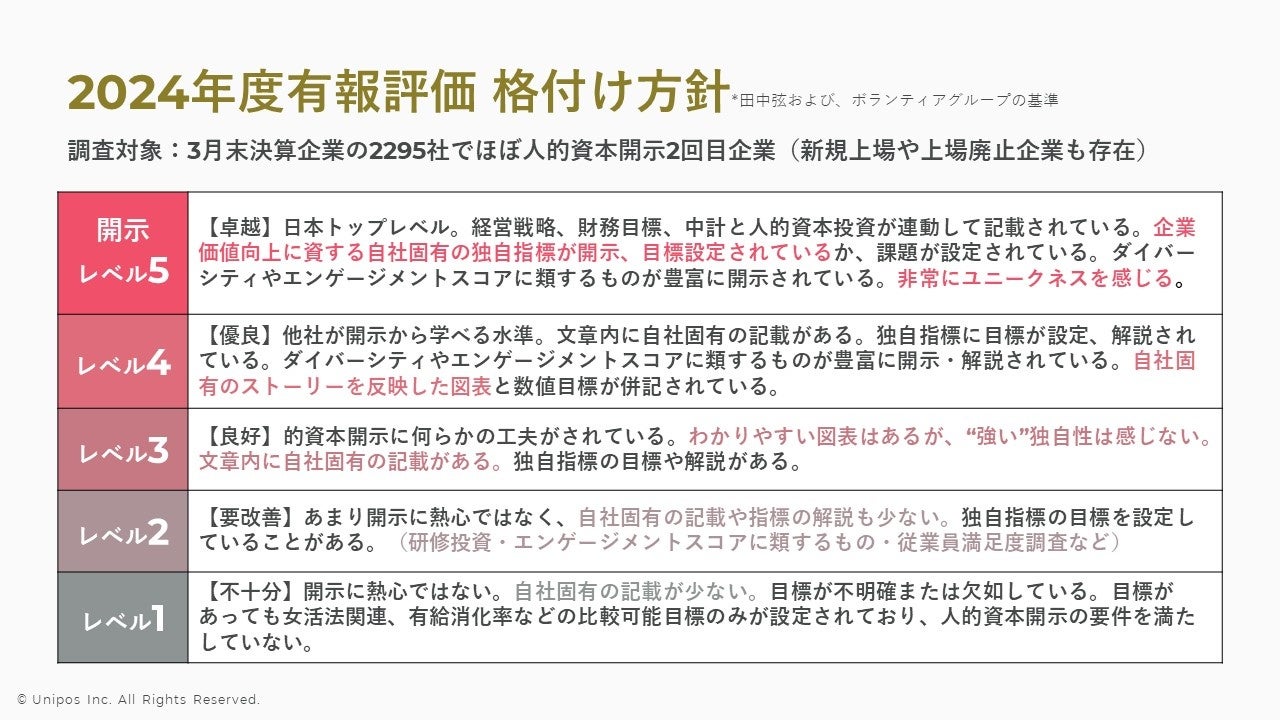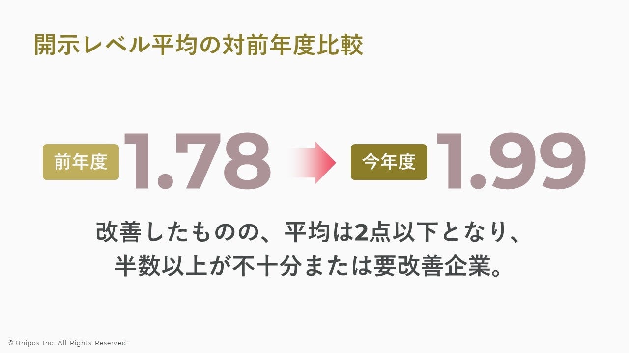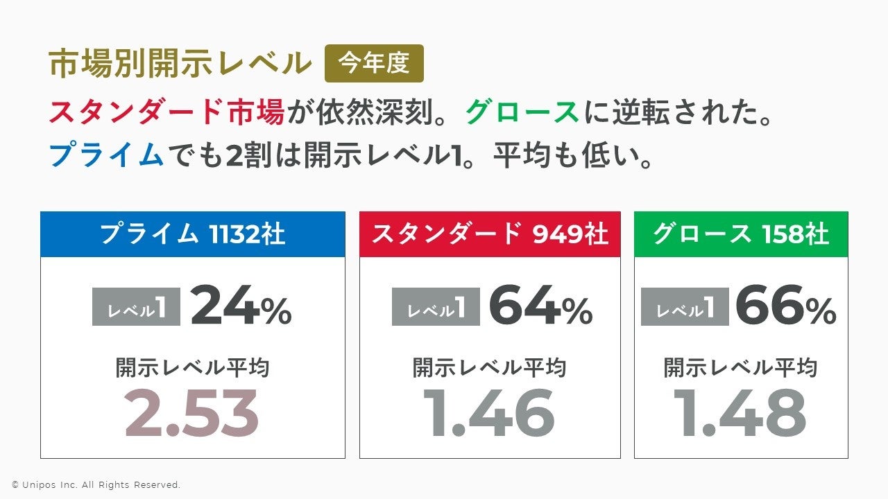 人と組織の行動力を引き出し、カルチャーを変えるwebサービス「Unipos」を提供するUnipos株式会社(本社:東京都渋谷区)は、当社代表取締役社長CEO田中弦が、昨年に引き続き有志のボランティアグループと共に2024年3月決算上場企業2,295社すべての有価証券報告書を調査。その結果、45%の上場企業が開示要件を満たしていない、市場別開示格付けではスタンダード市場がグロース市場に逆転されるなど、本格始動となった開示2年目に多くの課題が判明しました。そして、本分析結果を詳細に解説するため、累計申込1万2000名となった大人気企画「人的資本マニアック勉強会シリーズ」の最新版も開催いたします。人手不足時代の経営に欠かせない人的資本経営の現状を最速で知るこの機会にぜひご参加ください。