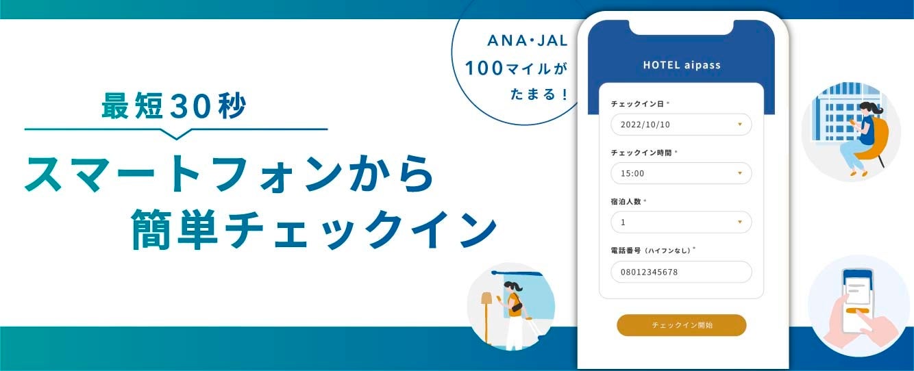スマートチェックインを行う際に、ANAもしくはJALのマイレージ番号を登録すると100マイルが付与されます(事前にチェックインしたお客さまのみ)。スマートチェックインは予約経路を問わず、スマートフォンをお持ちのすべてのお客さまが利用できるため、より充実した旅を楽しむことができます。