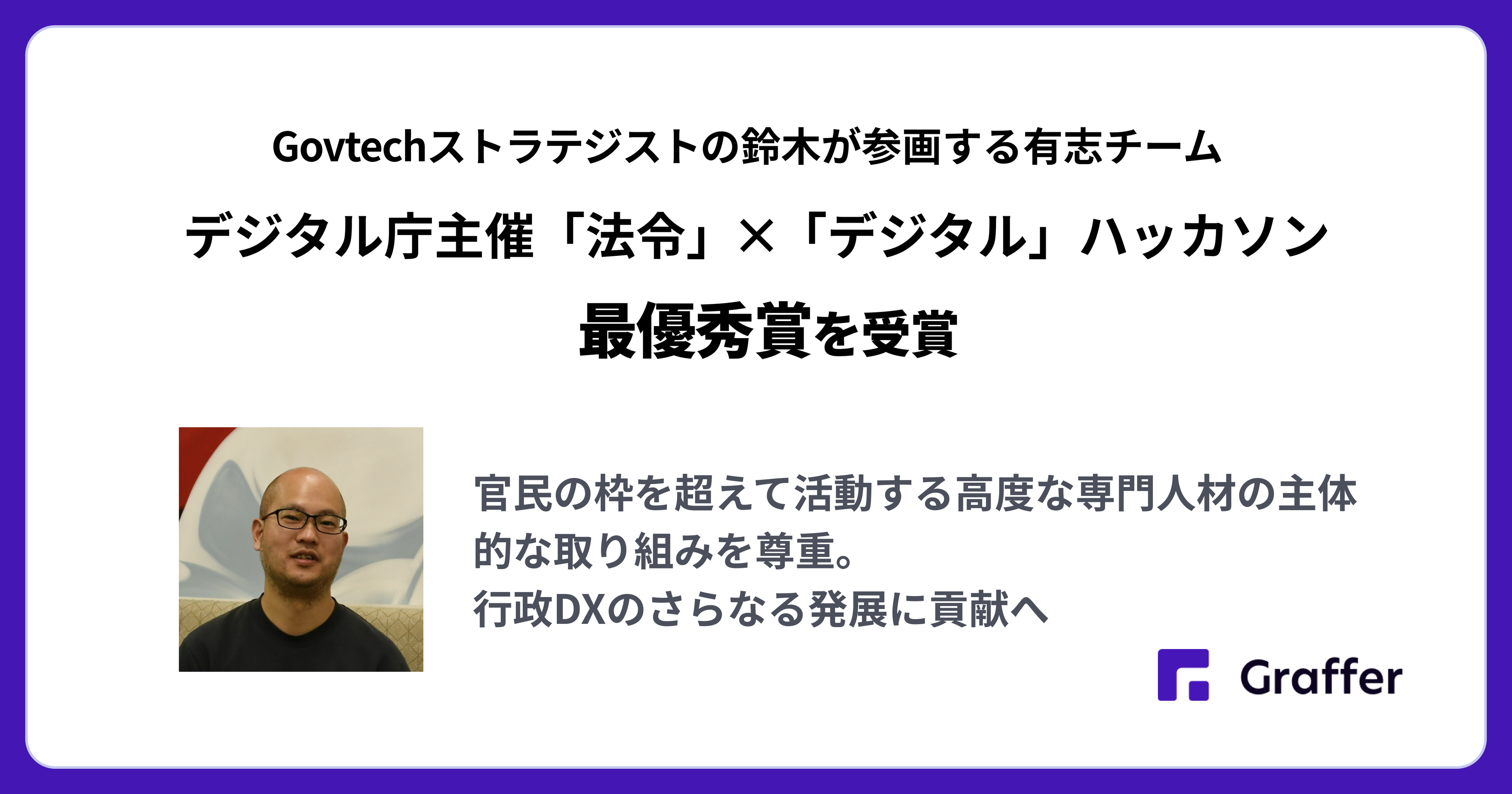 株式会社グラファー(本社:東京都渋谷区、代表取締役:石井大地、以下「グラファー」)は、デジタル庁が主催する「法令」×「デジタル」ハッカソンにおいて、当社Govtechストラテジストの鈴木がメンバーとして参画した有志チームが最優秀賞を受賞したことをお知らせします。本ハッカソンは、デジタル庁が提供する「法令等データ」や「法令API」を活用し、AI等の先端テクノロジーを組み合わせることで、法制事務の効率化や新たな民間サービスの創出を目指す取り組みです。2026年3月10日に開催されたプレゼンテーション・表彰式では、Govtechストラテジストの鈴木宏和がチームを代表してプレゼンテーションを行い、予選を通過したファイナリストの中から最優秀賞を受賞しました。今回の出場は、志を共にする個人が集まった有志チームによる挑戦です。当社では、官民の枠を超えて活動する高度な専門人材の主体的な取り組みを尊重し、今後もその知見を公共領域のデジタル社会の発展に還元できるよう支援してまいります。