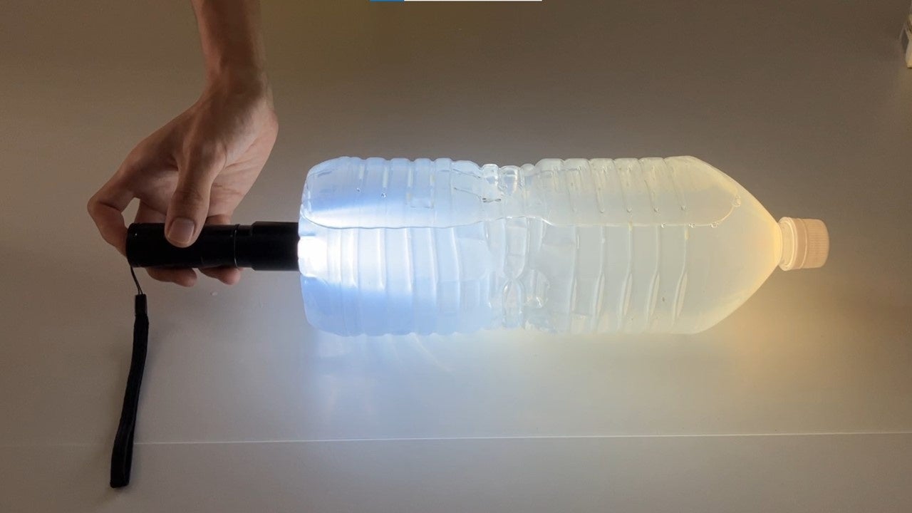 今回の理科実験教室では、光の散乱に注目した実験を行いました。水を入れたペットボトルの中に豆乳を数mL混ぜ、横からライトで照らすと、豆乳の粒子で光が散乱し、ペットボトルの中が色付いたように見えます。光はそれぞれの波長をもっていて、波長の長さにより様々な色に見えます。波長の短い青い光は散乱しやすいため、ライトに近い部分は青く見える一方、波長の長い黄色や赤い光は散乱しにくく、ライトから遠い端まで届きます。この現象が地球でも起きていて、日中の空が青く見えています。動画内では分かりやすい図を使ってこの原理を説明しています。ご家庭でも気軽に楽しめる内容となっておりますので是非お試しください。