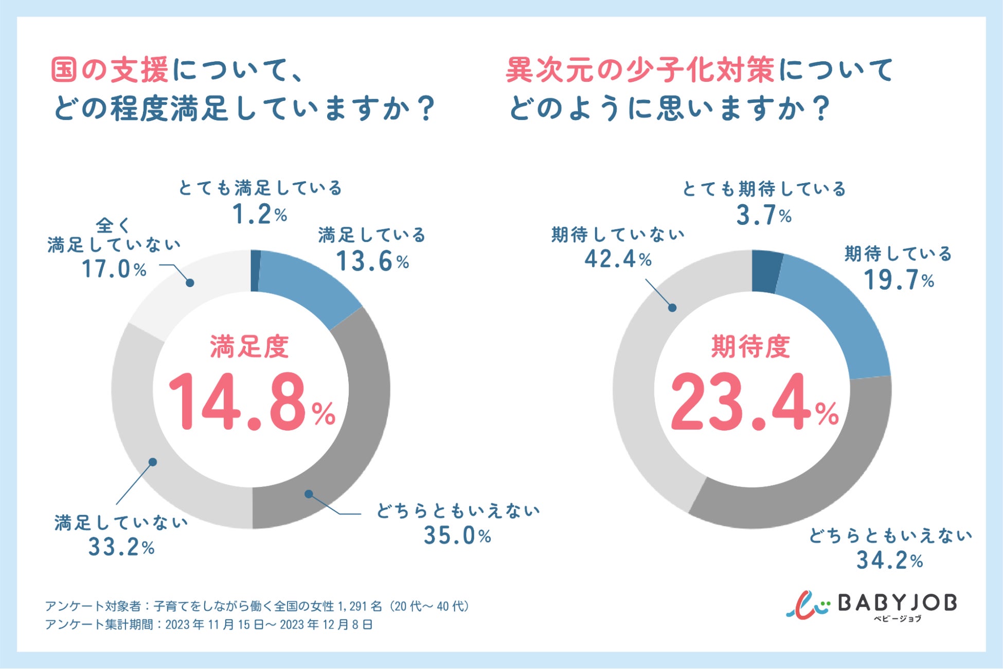 それに対し、政府は子育て支援として、2023年から異次元の少子化対策をテーマに掲げ、積極的な取り組みを行っていますが、「現在、国が進めている異次元の少子化対策についてどのように思いますか?」という質問に対し、「とても期待している」「期待している」と回答した人もたったの23.4%に留まりました。多くの女性が国の政策に対して、不満を抱いていることが明らかとなりました。