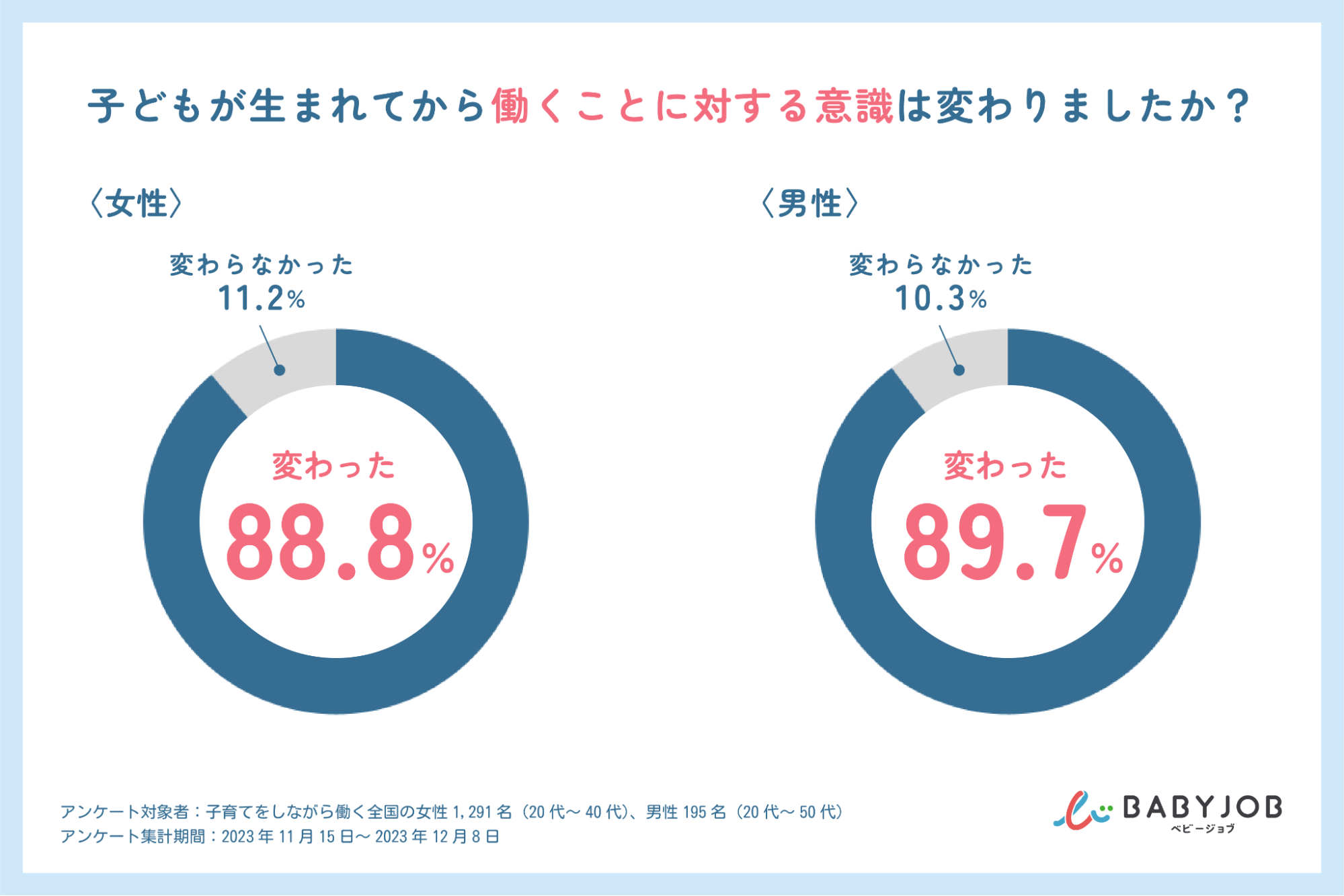 BABY JOBが、子育てをしながら働く男女1,486名を対象にアンケート調査を実施したところ、「子どもが生まれて働くことの意識が変わった」と回答した人は女性1,146名(88.8%)、男性175名(89.7%)と9割近い結果となりました。男女問わず、子どもの存在が仕事観に大きく影響を与えていることが明らかになりました。