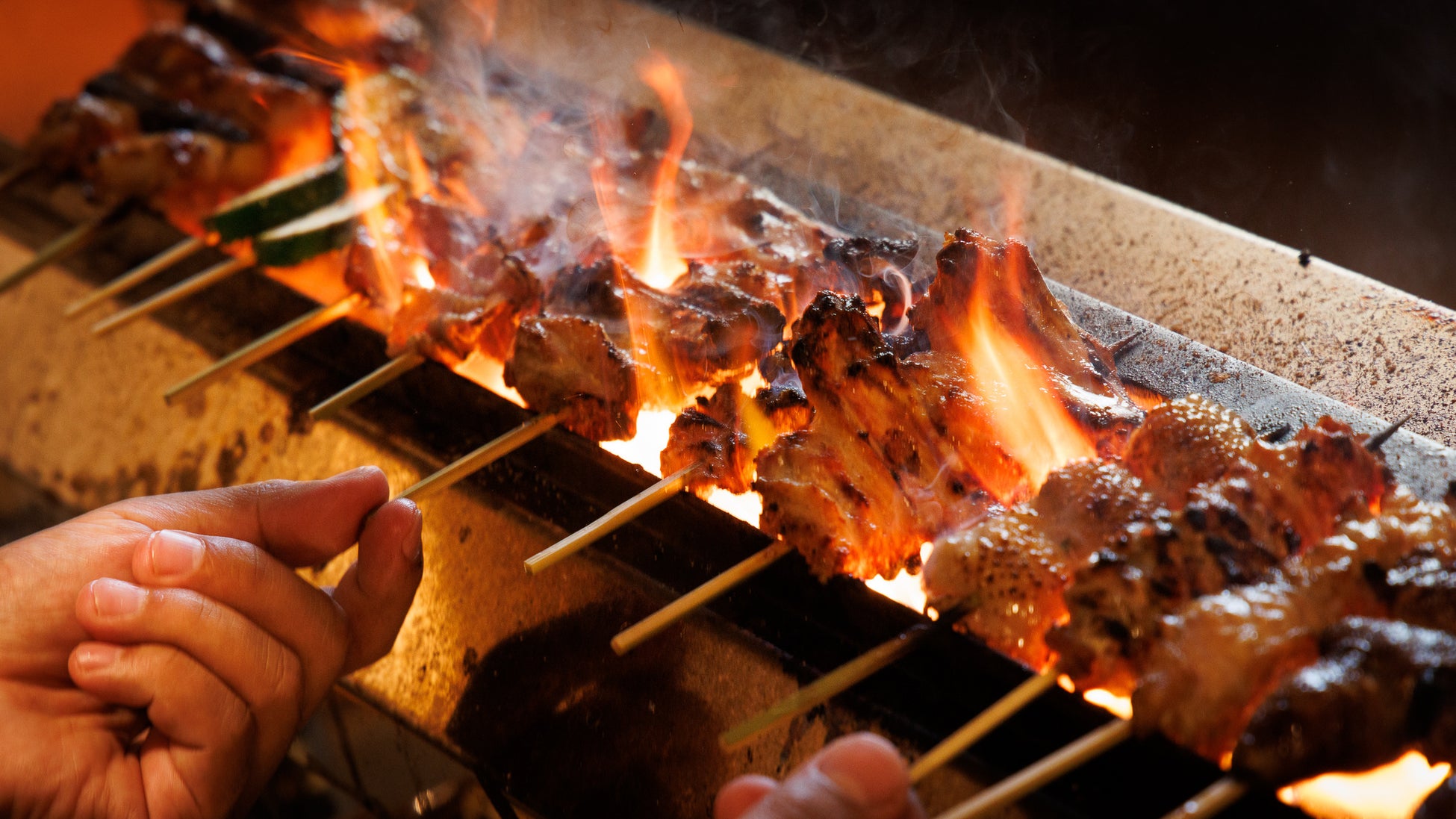 炭火で⾹ばしく焼き上げる⾷べごたえ⼗分な串焼き。