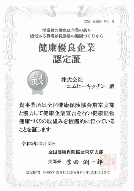 エムピーキッチンの働きやすい環境づくりの取り組み 健康優良企業『銀の認証』取得のお知らせ