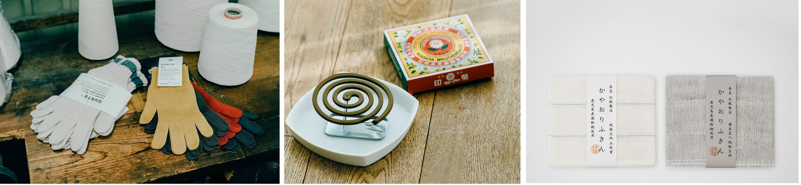中央:「除虫菊」という菊を主成分に天然由来の原料のみで、昔ながらの製法でつくった和歌山「児玉兄弟商会」の虫除け線香