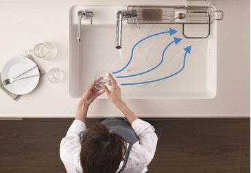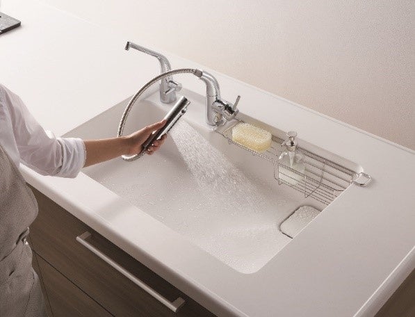ほうきのような幅広シャワーと斜め形状で、作業効率を高めた水栓です。空間が広いのでシャワーヘッドを伸ばせばシンクの内側も手早く洗えます。さらに、水に空気を含ませた「エアインシャワー」で節水効果を高めます。従来のシングルレバー水栓※2に比べて約38%節水しました。
