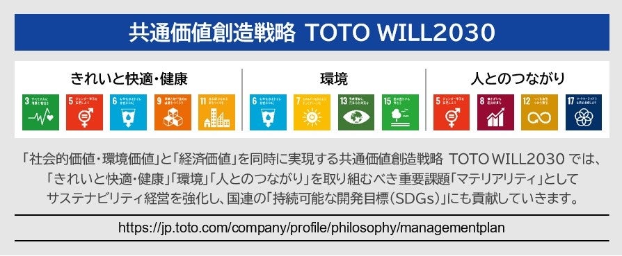 TOTOは、本商品を含む「きれいと快適・健康」「環境」を両立するTOTOらしい水まわり商品「サステナブルプロダクツ」を普及させることにより、地球環境に配慮した、豊かで快適な社会の実現に貢献していきます。