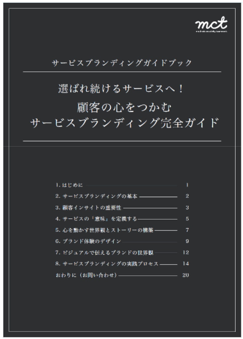 同質化が加速するなかで、価格でも機能でも差別化できない——そう感じているマーケター・ブランドマネージャーに向けて、株式会社mct(東京都渋谷区、代表取締役:白根英昭)は、顧客の潜在意識に存在する「意味」を起点にブランドを設計するための実践資料「サービスブランディング完全ガイド——選ばれ続けるサービスへ!」(全20ページ)を無料公開します。