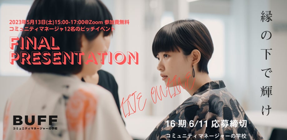 第15期生が3ヶ月間の受講成果をプレゼンする最終審査会を実施します。BUFFコミュニティマネージャーの学校および第16期募集概要についてもご説明します。